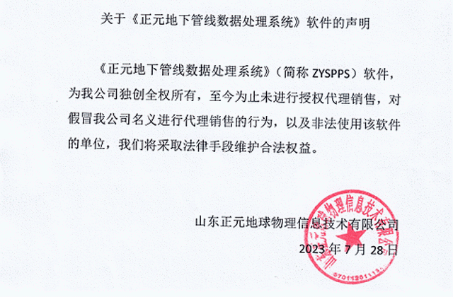 《正元地下管线数据处理系统》(简称ZYSPPS)软件,为我公司独创全权所有,至今为止未进行授权代理销售,对假冒我公司名义进行代理销售的行为,以及非法使用该软件的单位,我们将采取法律手段维护合法权益!